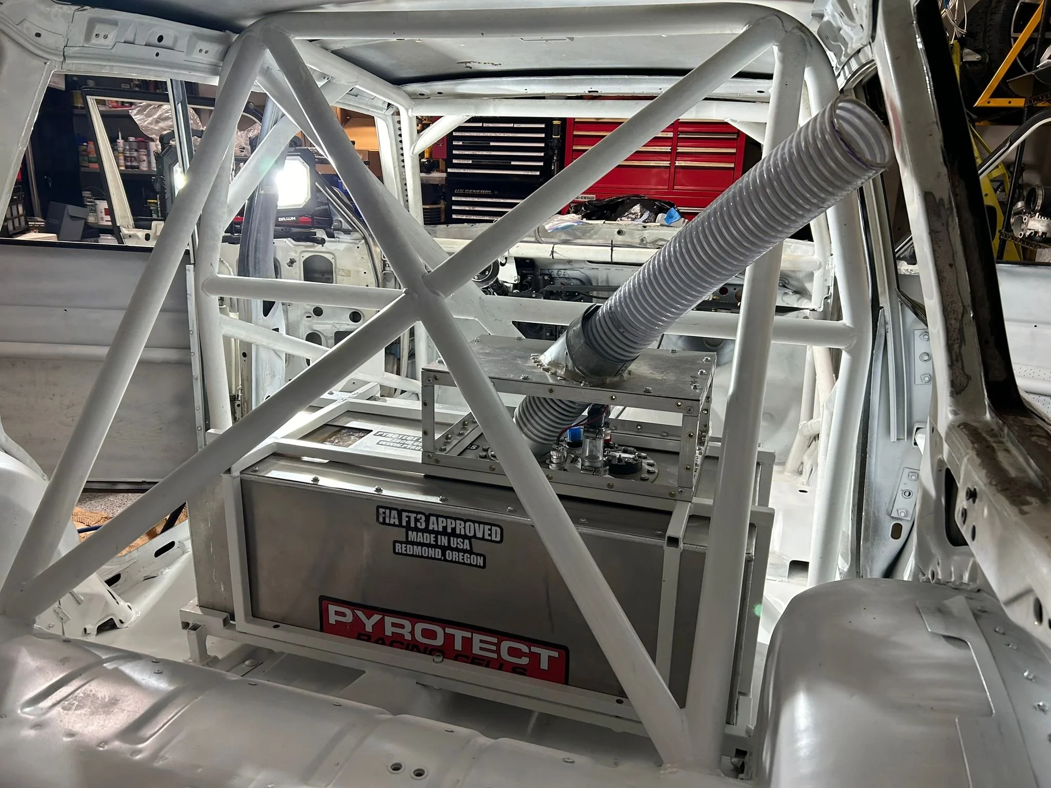 The endurance racing purpose of the car necessitated a custom large-capacity fuel cell to enable the roughly two hour driving stings we need to cover a reasonable number of miles in a weekend; this presents some practical challenges and the need for compliance with additional safety regulations.